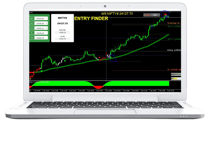 Entry Finder provides automatic buy/sell signals for intraday and swing trading, offering strong signals, profit booking, and re-entry points. Our software supports all major markets, including Commodity, Stock, Currency, MCX, NSE, NCDEX, MCX SX, COMEX, and FOREX.